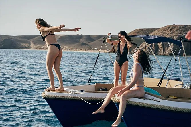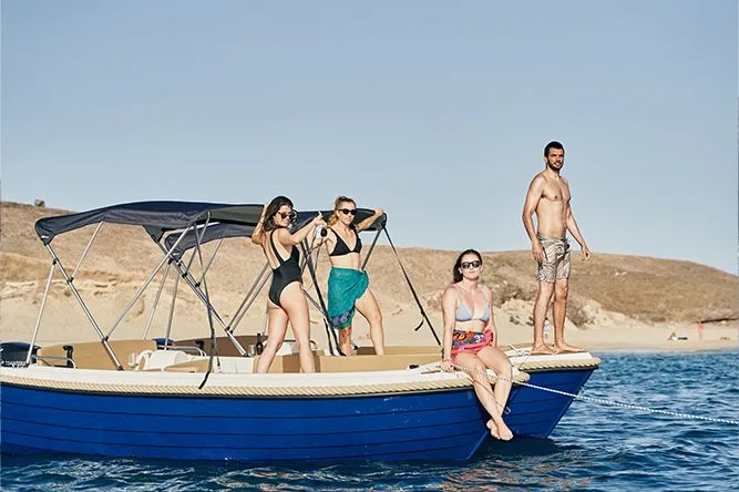 Das luxuriöseste Boot ohne Führerschein bei Rent a Boat Lanzarote. Um dieses Boot zu mieten, benötigen Sie weder einen Führerschein noch nautische Kenntnisse. Sie fahren es selbst, es ist äußerst einfach zu bedienen und absolut sicher. Es bietet Platz für 5 Personen. Das geräumige 2 Meter lange Sonnendeck lässt sich leicht in einen Tisch umbauen, an dem 5 Personen bequem sitzen können. Perfekt zum Sonnenbaden und um einen Sprung in das kristallklare Wasser Lanzarotes zu genießen und viele Fische beim Schnorcheln zu beobachten. Ausgestattet mit Schnorchelausrüstung erleichtert eine Badeleiter das Ein- und Aussteigen zum Schwimmen und eine Markise, die bei Bedarf wunderbaren Sonnenschutz bietet. Stornierungsbedingungen: 100 % Rückerstattung innerhalb von 24 Stunden. Treibstoff ist im Preis inbegriffen.